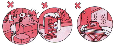 | 不 应 乱 拉 乱 接 电 线, 使 用 电 熨 斗、 电 吹 风、 电 热 杯、电 取 暖 器 等 家 用 电 热 器 具 时,人 不 能 离 开,也 不 要 用 灯 泡 取 暖 或 烘 拷 衣 物。 |  |