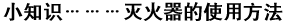 | 灭 火 时, 一 手 握 住 提 环, 另 一 手 握 住 筒 身 的 底 边, 将 灭 火 器 颠 倒 过 来, 喷 嘴 对 准 火 源, 用 力 摇 晃 几 下, 即 可 灭 火。 |  |